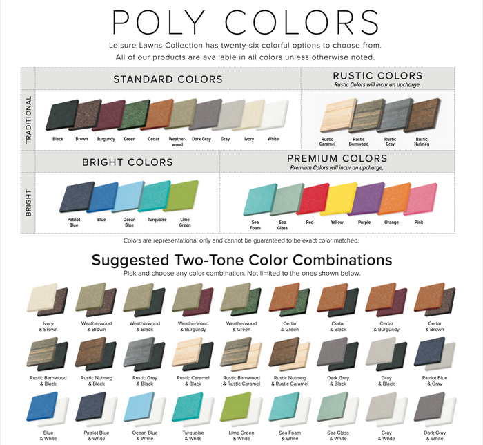 If you are looking for a maintenance-free furniture, Leisure Lawns outdoor poly furniture is the right choice! Unlike most outdoor furniture, their poly furniture will not rot, rust or fall apart from wear. It is easy to care for, does not require painting and is built to endure harsh weather. Because our poly imitates natural wood grain, the texture of the poly hides scratches and will maintain its beauty for many years. Leisure Lawns seventeen colorful options are infused with color and UV stabilizer to reduce fading, keeping your furniture beautiful for many years.