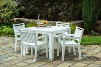 Seaside Casual furniture is made from Envirowood, an all weather marine grade recycled HDPE polymer - the kind found in milk jugs. Our furniture is essentially a maintenance-free product. Our HDPE material is non-porous and resistant to moisture, fading, insects, splinting, warping and other hazards of environmental exposure common to wood and wood fiber composite products. Customers concerned about the environment can feel confident they have made a good decision by purchasing our products. Unlike other types of resin and polymers, HDPE is the most environmentally stable, giving off no harmful fumes. Our products are designed to hold up to all kinds of adverse weather conditions for decades.